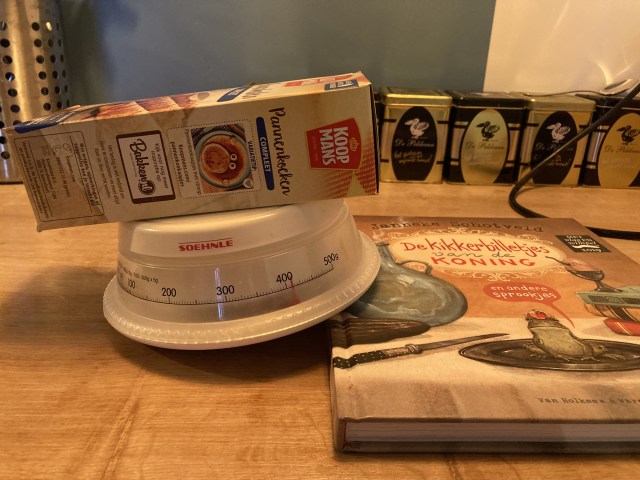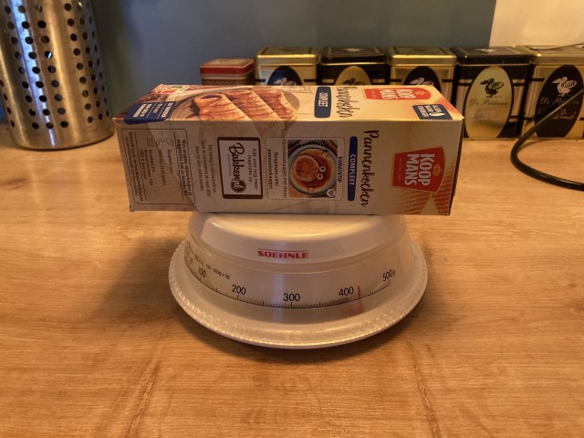 De weegschaal staat nu vlak en geeft ca. 425 gram aan.De weegschaal staat schuin en geeft nu ca. 410 gram aan. Nóg schuiner en dan glijdt het pak pannenkoekenmeel van de weegschaal af!