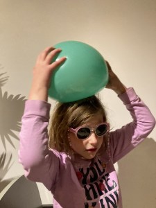 Leia wrijft met de ballon langs haar haar.Leia’s haar wordt nu aangetrokken door de ballon!