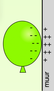 Je kunt de ballon ook laden door deze langs een sjaal of ander stuk stof te wrijven. Als je de negatief geladen ballon dan bij de muur houdt, worden de elektronen in de muur weggeduwd, waardoor de muur in de buurt van de ballon positief geladen wordt (de plusjes in het plaatje). Hierdoor trekken de ballon en de muur elkaar aan!