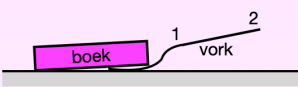 Doe dit nu nog een keer, maar druk nu helemaal aan het uiteinde van de steel van de vork (zo ver mogelijk weg bij het boek; bij de 2 in het onderste plaatje) naar beneden. Gaat dit nu makkelijker of moeilijker dan toen je aan het begin van de steel naar beneden duwde?